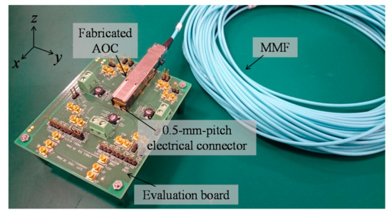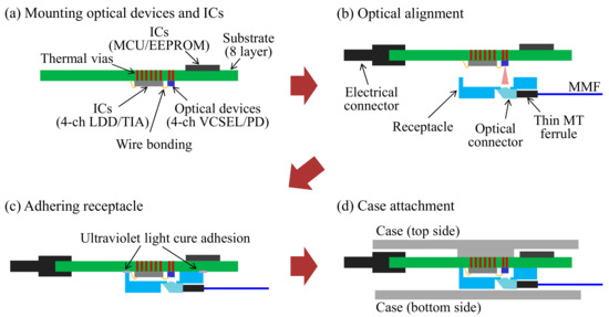 Based on the design described in Section 3, a prototype of the proposed AOC was fabricated according to the fabrication procedure, shown in Figure 5a–d, simple assembly technique: First, as shown in Figure 5a, optical devices and ICs were mounted on the backside of the substrate by die and wire bonding. The other ICs (micro control unit (MCU) and EEPROM) were mounted on the topside of the substrate. Second, the optical connector and receptacle was aligned above the optical devices by active alignment method. The optical connector consists of 12-ch optical lenses with a pitch of 250 μm and a 12-ch MMF with a 1-mm-thick mechanical transfer (MT) ferrule, and the 4-ch VCSEL and 4-ch PD are aligned with the lenses, simultaneously. Next, the optical connector was fixed onto the substrate by ultraviolet light cure adhesion, and the used master plug connector was removed from the receptacle. Finally, as shown in Figure 5d, they were attached to the case.