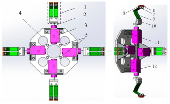 The grasping module of cross-arranged claws. 1—Secondary claws, 2—connecting rod, 3—cylinder, 4—main body, 5—fixture screw thread, 6—single tiny hook, 7—crew nut, 8—spring washer, 9—elastic steel sheet, 10—connecting plate, 11—support frame, 12—hose insertion of the cylinder.
