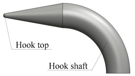 In Equation (6), , , and . Figure 6 shows the relationship between the maximum bending stress of the hook and the hook shaft diameter. The hook was made of 45 steel and was subjected to modulation processing. The top was unitized to increase wear resistance. The diameter of the hook neck shaft was set as by comprehensively considering the influences of strength, stiffness, and safety.
