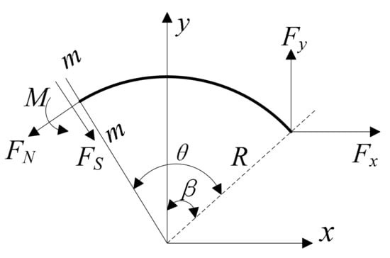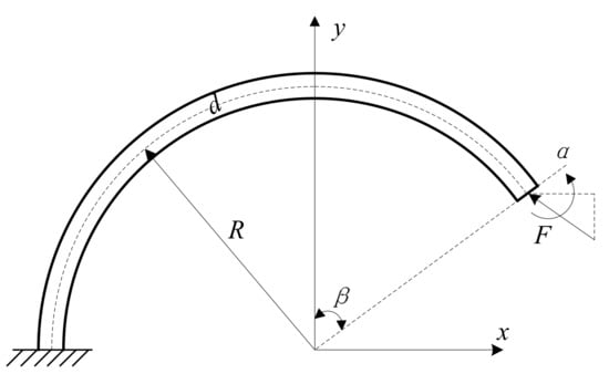 The hook should maintain sufficient strength during the hook–wall surface interaction, which is the basic condition to ensure stable grabbing. The stress model of the hook is equivalent to a bended suspension beam (Figure 3), where is the curvature radius of the hook, is the diameter of the hook section, is the angle of the hook top with the y axis, is the stress on the hook top, and is the rotation angle of the hook top with the z axis under the effect of force .