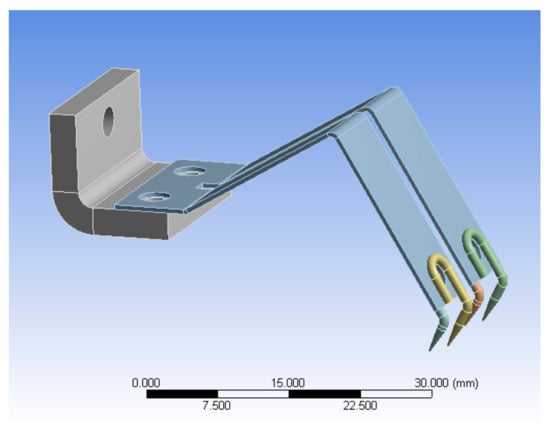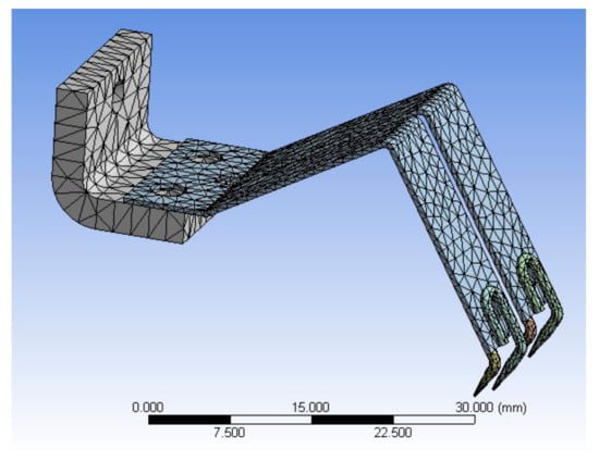 In order to analyze whether the design of the elastic claws meets the above requirements and verify the operating safety of the hooks, Solidworks was adopted for modeling, and the model was simplified according to the actual demand (Figure 7). After being imported in the ANSYS Workbench for mesh generation (Figure 8), nodes and elements were attained. The properties of the materials that were used for producing the claws are listed in Table 1.