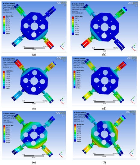 Based on the design of the pre-processing module, loads were applied for solution. The first six orders of modal were set and solved in the solution item max models to find, and the total deformation was inserted into each order of modal. Through solution, the vibration modes and natural frequencies of the first six orders of the grasping module were obtained. The cloud pictures of the displacement are illustrated in Figure 11.