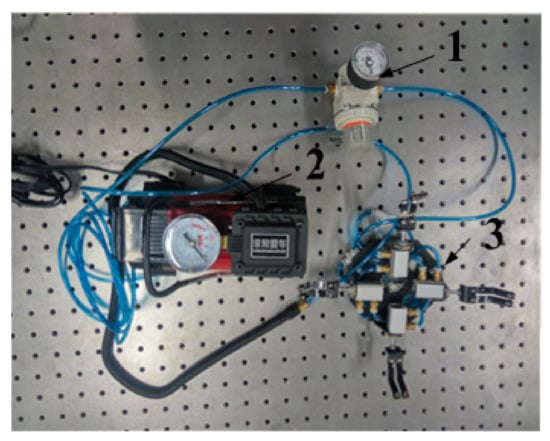 The grasping claws system prototype. 1—Pressure control valve, 2—vehicle mounted pump, 3—grasping module of the claws.