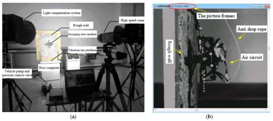 Indoor grabbing experiments of the grasping claws. (a) Vibration experiment of the grasping claws; (b) The picture of grabbing process.