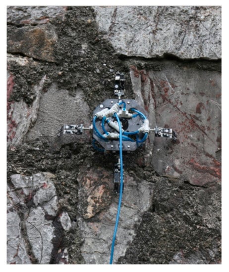 Wall climbing robots, which are a special operation mechanism in extreme environment generally adhere to walls by virtue of negative suckers, permanent magnets, or bio-inspired adhesion [,,,,,]. However, magnetic adhesion fails for wall surfaces under long-term vibrations, such as diagonal cable bridge towers and viaduct bridge piers. Vacuum adhesion becomes instable due to the influence of vibrating wall surfaces. Bio-inspired viscous materials tend to detach from dusty and rough walls.