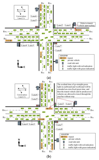 An example of intersection with the transit signal priority (TSP) control systems. (a) Before the priority strategy is applied; (b) After the priority strategy is applied.
