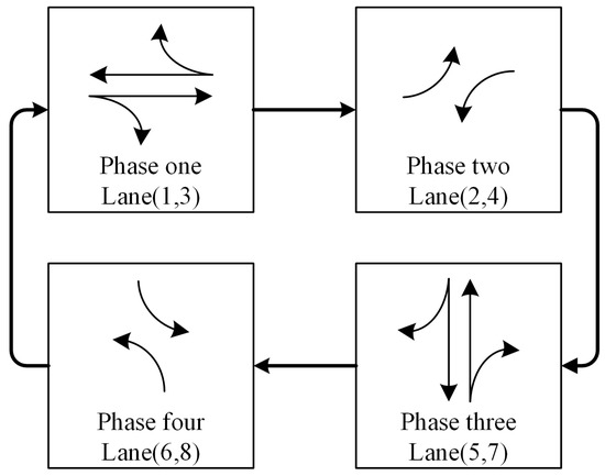 Before further describing the control logic, the movement of traffic flow and the phase of signal light should be defined. A movement specifies the vehicle’s trajectory at the intersection. In Figure 1, by taking road section as an example, there are three movements including and . Therefore, there are totally 12 movements at the intersection and, among them, the four turn-right movements can be combined into the four go-straight movements. Movements are divided into many groups, and these groups can be named as a phase. When a phase is selected, related movements receive a permission signal (e.g., green light), while all other movements receive a prohibit signal (e.g., red light).