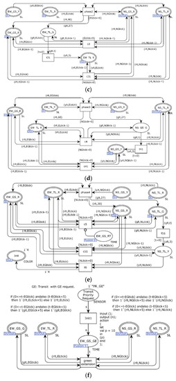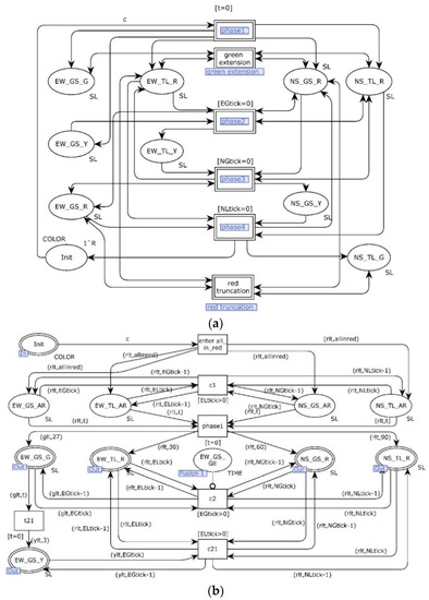 - Huang, Y.; Weng, Y.; Zhou, M. Modular design of urban traffic-light control systems based on synchronized timed Petri nets. IEEE Trans. Intell. Transp. Syst. 2014, 15, 530–539. [Google Scholar] [CrossRef]
