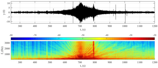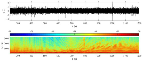 Figure 1 (bottom) is a spectrogram (fast Fourier transform (FFT) size 1024, Hann window) of the signal and scale that reflect the dependency of color on the levels of spectral components of the signal in dB; the scale is conventional. Spreading in a fan-like shape, slope lines on the spectrogram physically represent an interference pattern changing over time, typical for the moving source of radiation in a hydroacoustic waveguide [7,8]. When listening to the signal, one can hear clicks at the time interval that corresponds to the minimum distance of the passing vessel; these clicks are caused by the propeller cavitation.