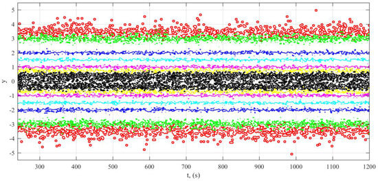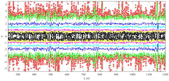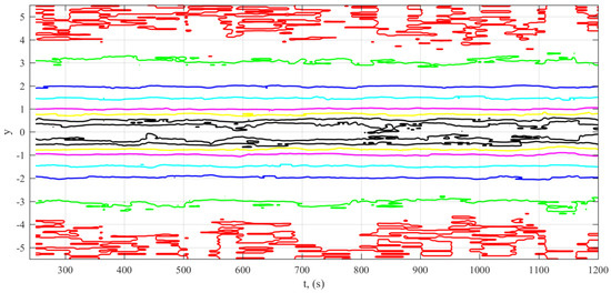 Underwater noise signal after AGC and normalization by the level. Lines of equal probability for consecutive probability density function (PDF) for T = 10 s, see Figure 4. This is lines of equal probability of the values of w(y): 0.000134 (red), 0.004432 (green), 0.053991 (blue), 0.1295 (cyan), 0.241971 (magenta), 0.3521 (yellow), 0.3867 (black). For the Gaussian distribution with the mean equal to 0 and variance equal to 1, this would be corresponding to the straight lines—also in accordance with values of y: ±4, ±3, ±2, ±1.5, ±1, ±0.5, ±0.25.