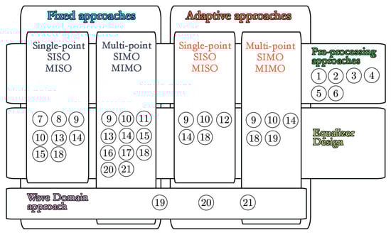 A general classification of room response equalization (RRE) systems. Possible approaches: ① short filters, ② complex smoothing, ③ frequency warping, ④ Kautz filters, ⑤ multirate approaches, ⑥ room impulse response (RIR) reshaping, ⑦ homomorphic filtering, ⑧ linear predictive coding analysis, ⑨ least-squares optimization techniques, ⑩ frequency domain deconvolution, ⑪ multiple-input/multiple-output inverse theorem (MINT) solutions, ⑫ average and weighted average methods, ⑬ clustering methods, ⑭ prototype approach, ⑮ common acoustical poles compensation, ⑯ modal equalization, ⑰ plane wave approach, ⑱ quasi-anechoic approach, ⑲ wave domain adaptive filtering, ⑳ transform domain approaches, ㉑ room geometry aware methods. MIMO: multiple-input/multiple-output; MISO: multiple-input/single-output; SIMO: single-input/multiple-output; SISO: single-input/single-output.