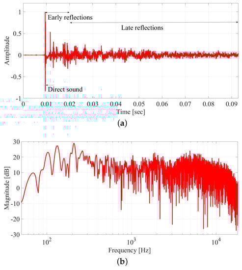 An impulse response, obtained from a sound source in a specific position of a real environment, can be divided into three parts [13]: (i) direct sound; (ii) early reflections, and (iii) late reflections, as reported in Figure 2a. The transition from early reflections to late reflections is given by the mixing time, estimating the time elapsed from early to late reflections. It can be estimated in several manners [14,15]. Direct sound and early reflections are fundamental for the localization of the sound source and perception of its timbre [16,17,18], while the late reverberation provides cues on the spaciousness of the room [19]. Studies on the perception of reflections and their influence on the timbre can be found in [19,20,21,22,23,24,25]. The spectral content of direct and reflected sound is different. Walls, drapes, and upholstery typically absorb the high frequencies of reflections. The effect is boosted by multiple reflections, with the late reverberation typically having a much lower energy in the high frequencies.