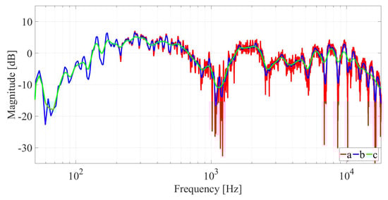 Complex smoothing of a measured room transfer function (RTF): (a) RTF; (b) 1/12 octave-band complex smoothing; (c) 1/3 octave-band complex smoothing.