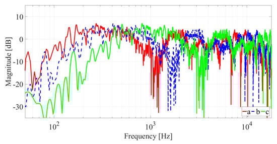 At low frequencies, the wavelength is comparable to typical room dimensions: standing waves may appear in a room for steady-state signals, resulting in well defined position-dependent maxima and minima of the magnitude response. At these frequencies, the room response has a smooth behavior characterized by well separated resonances and notches, as illustrated in Figure 2b. The resonances and notches are determined by interference patterns caused by the direct sound and reflections, with notches appearing when the path-length difference is an odd number of half wavelengths. The notches become increasingly dense with increasing frequency. For frequencies greater than the Schroeder frequency [13], the frequency response becomes extremely irregular. Spectral peaks are more audible than notches [20], but wide-bandwidth notches are also audible [26]. At high frequencies, the peaks and notches strongly depend on the position in the room and on factors like the room humidity and temperature [27,28,29] or obstacle movements [30,31,32,33,34]. It must be pointed out that these large variations in the response have little influence on the subjective impression of the listener [18]. It has been suggested [19,22,24] that the ear is more sensitive to signal onsets (i.e., to the full spectrum of the initial part of the RIR) and that it largely ignores the high-frequency components of the late reverb [35]. This aspect should be considered in the equalizer design.