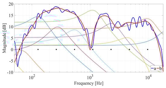 Kautz filters have been used for RRE, exploiting the nonuniform frequency resolution of these filters. They have been applied both for minimum-phase and mixed-phase equalization, using both fixed poles or tuned poles [54,55]. When a fixed pole approach is used, the Kautz filters can also be designed and implemented in the form of a filterbank of second-order sections [112,113,114], with advantages for the computational complexity. In [114,115], the theoretical equivalence of parallel filters and Kautz filters is shown, and formulas to convert the parameters of the two structures into each other are given. Figure 7 reports a parallel filter design example following the methodology of [114].