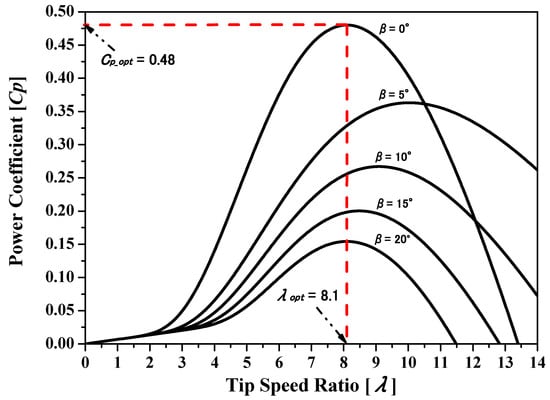 The Cp vs λ characteristics shown in Figure 1 are obtained using Equation (2) with different values of the pitch angle (β). When β is equal to zero degrees, the optimum power coefficient (Cpopt) is 0.48, and the optimum tip speed ratio (λopt) is 8.1.