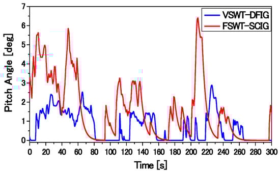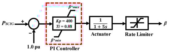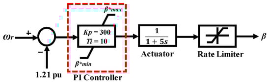 Figure 2 and Figure 3 show the models of the blade pitch control system for FSWT and VSWT [], respectively. In FSWT, the pitch control system is used to control the power output of the SCIG so as not to exceed the rated power. In VSWT, the rotor speed of DFIG is regulate by the pitch controller so as not to exceed the rated speed. The control loop of the pitch actuator is represented by a first-order transfer function with a pitch rate limiter. A PI controller is used to manage the tracking error.