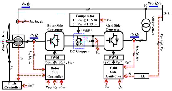 The wind turbine drives the WRIG to convert wind power into electrical power. The rotational speed (ωr) is obtained from the rotor of the WRIG. A pitch controller is used to control the blade pitch angle of the wind turbine in order to reduce the output power when the rotational speed exceeds the rated speed. The WRIG model available in the PSCAD library is used in the present study []. The rotor position (θr) is derived from the rotor of the WRIG. As indicated by the configuration of the VSWT-DFIG system, the stator terminal is directly connected to the grid system. The AC/DC/AC converter is installed between the rotor of the WRIG and the grid system. The rating of the converter is 30% of the WRIG rating. The pulse width modulation (PWM) technique is used to generate the necessary gate pulses for driving the AC/DC/AC converter. The carrier frequency is taken as 3.0 kHz. The RSC is connected to the rotor winding of the WRIG, which provides variable frequency excitation depending on the wind-speed condition. The GSC is connected to the grid system through a transformer. A protection system with a DC chopper is installed in the DC-link circuit. The DC chopper is controlled by the comparator block, which triggers the DC chopper switch when the DC-link voltage becomes greater than or equal to the predefined limit (Vdc ≥ 1.15 pu).