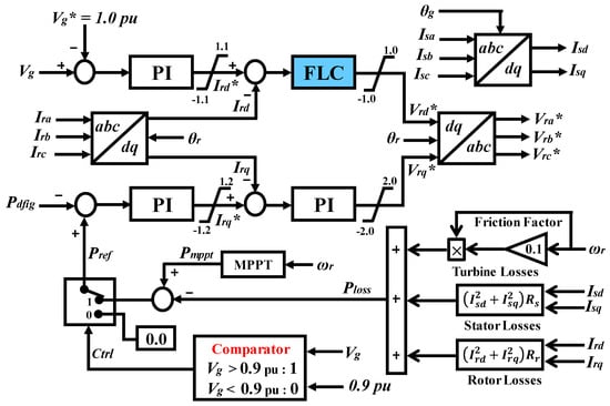 The proposed controller for the RSC is depicted in Figure 6. This controller consists of three PI controllers and one FLC. The main motivation behind using one FLC in the inner loop of the cascaded controller is maximization of the reactive power injection. The FLC offers variable gain depending on the system parameters. Due to the variable gain, the FLC can inject reactive power (Qdfig) more effectively in the fault condition. Thus, the grid voltage can quickly be retraced back to the nominal value. Moreover, the FLC can stabilize a higher rating of the SCIG as compared to the conventional PI-based controller of the RSC in the inner loop.
