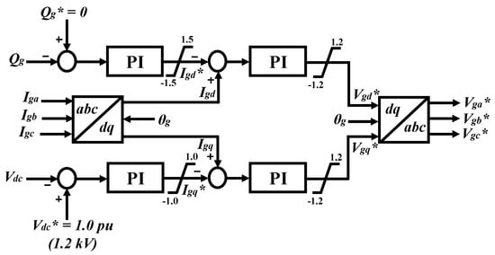 The controller for the GSC is depicted in Figure 7. This controller consists of four PI controllers to compensate different error signals. The GSC reactive power (Qg) and DC-link voltage (Vdc) are controlled through d-axis (Igd) and q-axis (Igq) current components, respectively. The reactive power reference is set to zero, and the DC-link voltage reference is set to 1.0 pu (1.2 kV).