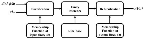 Figure 8 shows a block diagram of the proposed FLC. The FLC is composed of fuzzification, a membership function, a rule base, a fuzzy inference, and defuzzification, as shown in Figure 9.