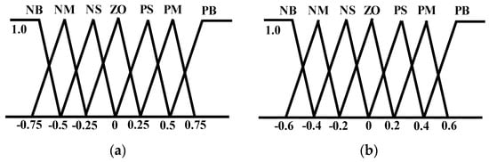 The triangular membership functions with overlap used for the input and output fuzzy sets are shown in Figure 10, where linguistic variables are indicated as NB (Negative Big), NM (Negative Medium), NS (Negative Small), ZO (Zero), PS (Positive Small), PM (Positive Medium), and PB (Positive Big).