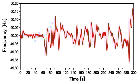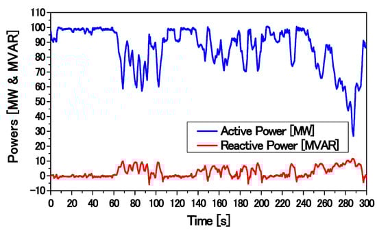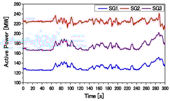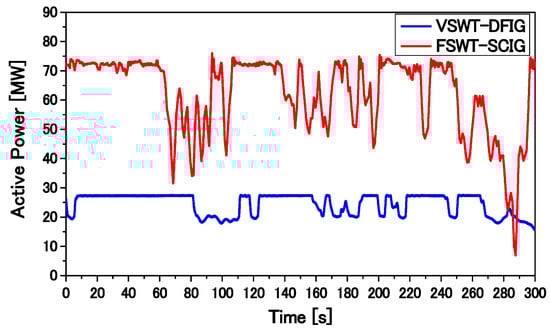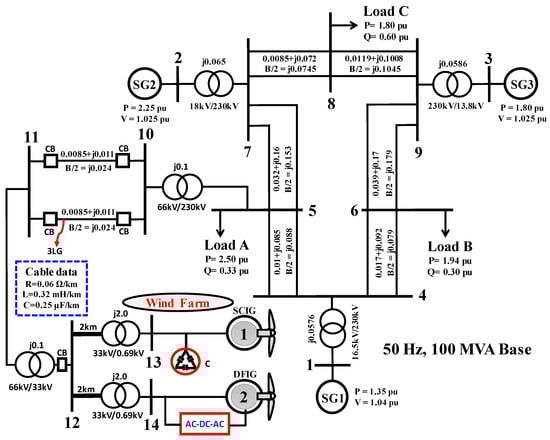 A WF is connected to the main system at bus 5, as shown in Figure 11, and consists of one VSWT-DFIG and one FSWT-SCIG. In order to reduce computational time, each wind generator is represented as an aggregated equivalent single machine [,]. The total capacity of the WF is 100 MW. A capacitor bank (C) is used for reactive power compensation of the SCIG. The value of C is chosen such that the power factor of the SCIG-based wind generator becomes unity at the rated operating condition. The base power of the system is 100 MVA, and the rated frequency is 50 Hz. The parameters of the DFIG and the SCIG are presented in Table 5.