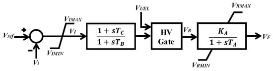 The power system model used for transient stability analysis is shown in Figure 11. The model is composed of a nine-bus main system [] and a WF. The main system is composed of three conventional power plants: two thermal power plants (SG1 and SG2) and one hydropower plant (SG3). Both SG1 and SG3 are operated under automatic generation control (AGC), and SG2 is operated under governor-free (GF) control. The parameters of the SGs are listed in Table 2. The IEEE type AC4A excitation system model shown in Figure 12 is considered for all SGs []. Table 3 lists the parameters taken from []. Figure 13 shows a block diagram of the reheat steam turbine governor system used in the thermal power plants (SG1 and SG2) []. The hydro turbine governor model system used for the hydropower plant (SG3) is shown in Figure 14 []. The parameters of both turbine systems are presented in Table 4 []. For AGC operation, an integral controller is installed on the governor system for both SG1 and SG3.