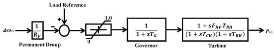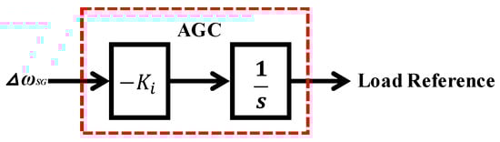 The integral controller on selected units for AGC is shown in Figure 15 []. The output of the AGC supplies the power load reference of the governor system depending on the speed deviation of the SG (Δωsg). The integral gain Ki is set to 6.