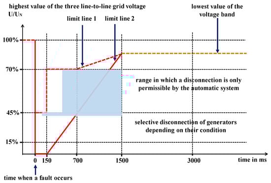 The requirement of LVRT for wind power is depicted in Figure 16 []. The WF must remain connected to the grid if the voltage drop is within the defined r.m.s. value and its duration is also within the defined period, as shown in the figure. If the voltage of the connection point recovers to 90% of the rated voltage within 1.5 s following the voltage drop, all wind turbines within the WF shall stay online without tripping.