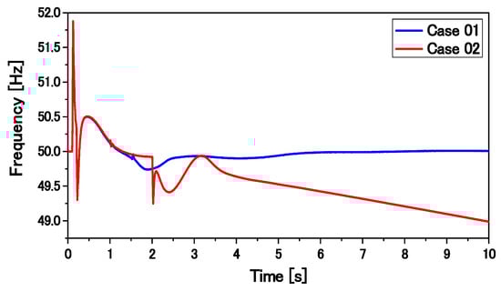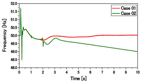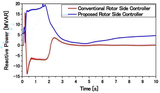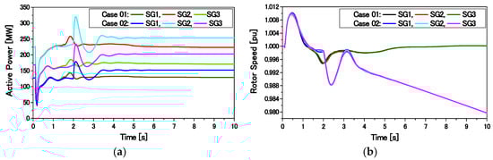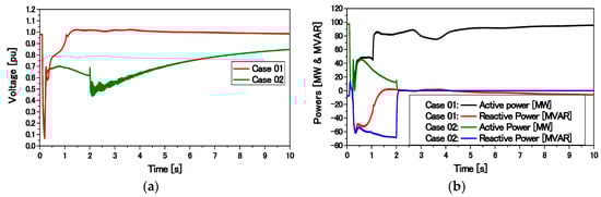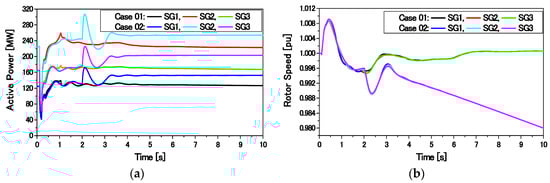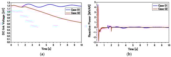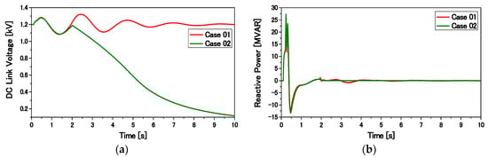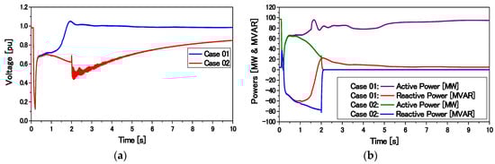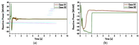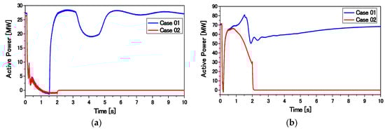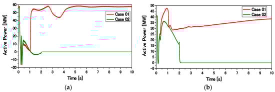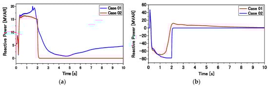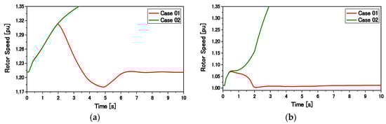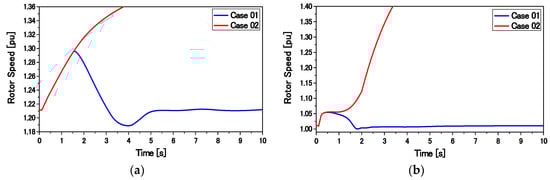Figure 17a,b show the responses of reactive powers, which indicates that the DFIG can provide the necessary reactive power during the severe symmetrical 3LG fault in Case 01. As a result, the connection point voltage recovers to the rated value quickly in Case 01, as shown in Figure 18a. However, in Case 02, the DFIG does not provide the necessary reactive power during the fault condition. Thus, the connection point voltage cannot recover to the rated value. Since the connection point voltage does not satisfy the standard grid code of Figure 16 in Case 02, the WF is disconnected from the power system by opening CBs near bus 12 at 2 s. The rotor speed responses of both wind generators are stable in Case 01, but unstable in Case 02, as shown in Figure 19.
