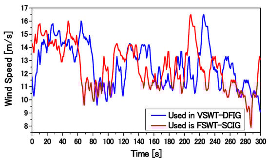 where Tw is the wind turbine torque, β is the pitch angle, and λ is the tip speed ratio. Moreover, c1 through c6 are the characteristic coefficients of the wind turbine (c1 = 0.5176, c2 = 116, c3 = 0.4, c4 = 5, c5 = 21, and c6 = 0.0068) [], and ωr is the rotational speed of the wind turbine (rad/s).