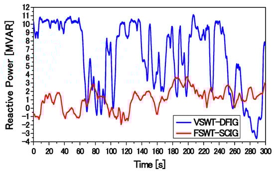 Most wind turbines are constructed using fixed-speed wind turbines with squirrel cage induction generators (FSWT-SCIGs). SCIGs have some advantageous characteristics, such as simplicity, robust construction, low cost, and operational simplicity []. However, FSWT-SCIGs are connected directly to the grid and have no LVRT capabilities during voltage dips []. Moreover, the FSWT-SCIG requires a large reactive power in order to recover air gap flux when a short circuit fault occurs in the power system. If sufficient reactive power is not supplied, the electromagnetic torque of the SCIG decreases significantly. As a result, the rotor speed of the SCIG increases significantly and can make the power system unstable []. Reactive power compensation is a major issue, especially for FSWT-SCIGs. A capacitor bank is usually used to meet the reactive power compensation requirement of an SCIG. However, the SCIG requires more reactive power during fault conditions than in the steady state, and the capacitor bank is not able to supply more reactive power during transient conditions.