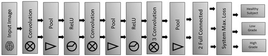 - Fully-connected layers: They consist of two layers where each one of them decreases the spatial size of the input to 1 × 1. The filter depth is equal to 3, corresponding to our three classes: healthy subjects, patients having a low-grade tumor and patients having a high-grade tumor.