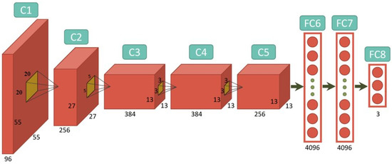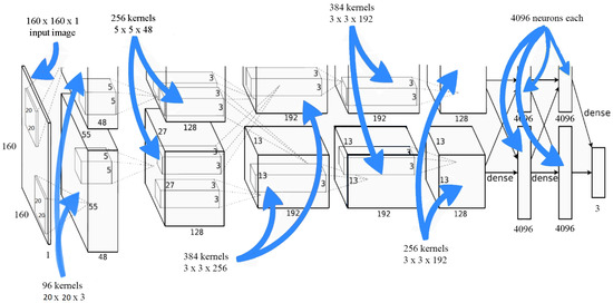 We implemented a modified version of AlexNet where the size of the input image is 160 × 160 kernels [31] as shown in Figure 3. More specifically, the layers’ configurations relative to the types and specifications of our network architecture are as follows, and Appendix A can be referred to for these layers’ definitions.