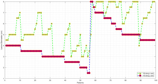 Figure 4 shows the size of lesion for each of the individual patients along both major perpendicular axes. Some of the patients in this study have a lesion size less than 2 cm. All images available from the database are used for training and evaluation of the designed classifier irrespective of the lesion sizes. Additional details regarding the detailed distribution of lesion size among the 18 classes are provided in Appendix B.