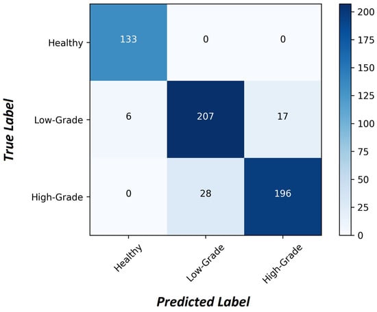 The customized ConvNet image identification and classification system presented in this report demonstrated very accurate results in classifying input images into three main diagnostic categories. The three classification labels corresponding to the brain’s state were healthy, low-grade tumor or high-grade tumor. In the evaluation phase, we used four measures to prove the efficiency of the proposed approach including accuracy, precision, recall and F1 score, which are defined in Appendix D [36]. Figure 7 illustrates the confusion matrix along with the labels of the three classes in our dataset. These four measures were calculated using the confusion matrix, which was generated after running our trained ConvNet on the testing subset consisting of 587 image samples.