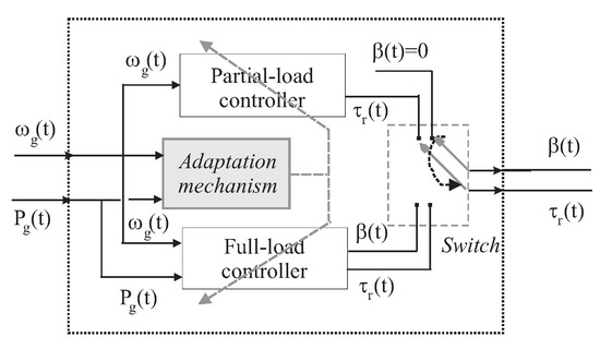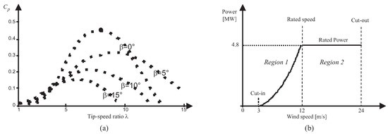 Finally, note that in Region 2 (partial load, below the rated wind speed) the wind turbine is regulated only by means of the torque input . In this situation, the blade pitching system is not exploited to achieve the optimal power conversion, as highlighted in Figure 4. On the other hand, in Region 2 (full load, above the rated wind speed), the wind turbine control regulates both the blade pitch angle and the control torque . The wind turbine Simulink model considered in this work includes also saturation blocks that limit the values of the control signals, which were not reported in Figure 1 and Figure 4.