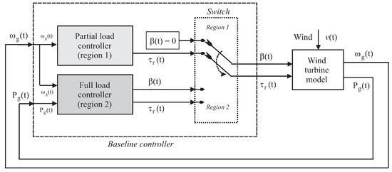 Figure 3 also shows the power curve that highlights the the so-called partial load (Region 1) and full load (Region 2) working conditions of a wind turbine [22]. In fact, the baseline controller implemented in the wind turbine simulator works in these two operating conditions. A schematic diagram of the baseline wind turbine controller system is detailed in Figure 4.