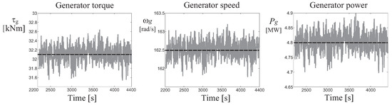 In particular, Figure 4 highlights that in partial load working condition, the optimal tracking is achieved without any pitching of the blades, which are fixed to zero degrees. In this case, is constant at its optimal value , that is defined by the maximal value of the power coefficient map when degrees, as shown in Figure 3a. Therefore, this working condition is completely defined by setting (i.e., the generator torque is equal to the required reference value) with pitch angle degrees.