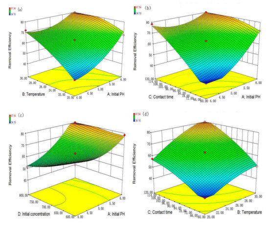 Three dimensional response surface plots for the malachite green (MG) removal: (a) Initial pH—Temperature; (b) Initial pH—Contact time; (c) Initial pH—Initial concentration (d) Temperature—Contact time; (e) Temperature—Initial concentration; (f) Contact time—Initial concentration.