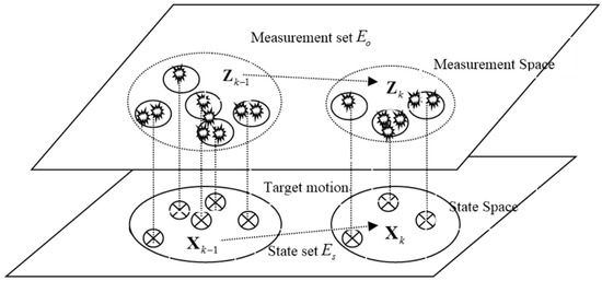 The MTT system is different from the single target tracking system. Here, the multi-targets space model shown in Figure 1 can be more intuitively understood than the MTT system. The RFS introduced in MTT is to describe the target state and measurement. Suppose that at time k, express the target states and belong to the state space , and express the measurement and belong to the measurement space . Then, RFS of target state and measurement at time k can be described as in Equation (1).