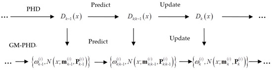 The PHD filter is a recursion algorithm that propagates the intensity function associated with the multi-targets posterior probability. To implement the PHD filter, under a linear target system, the Gaussian mixture (GM) method has been introduced in the PHD filter. Additionally, it forms the GM-PHD filter algorithm. The relationship between the PHD and GM-PHD is shown as in Figure 2.