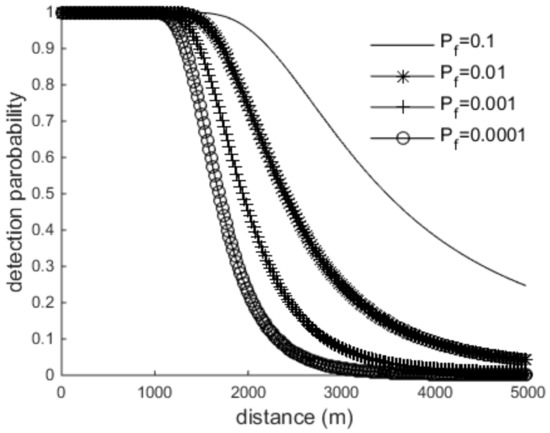 Assuming that the active detection method is adopted, the wave front is the cylindrical wave when distance is far away, . According to Equation (21), , combining Equation (28). The relationship between the detection probability, the false detection probability and the distance is shown in Equation (29).
