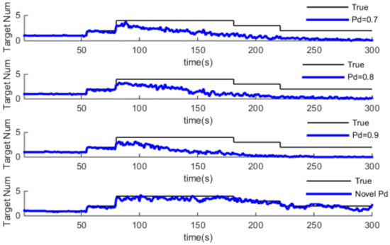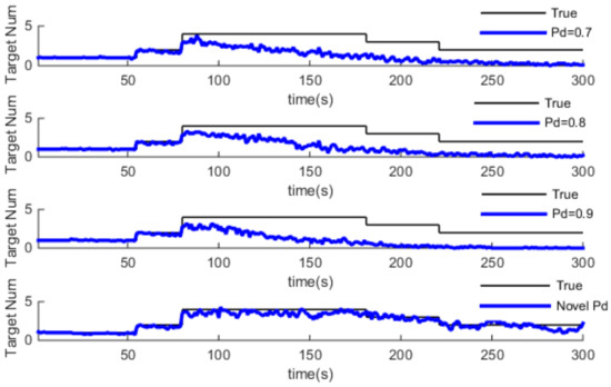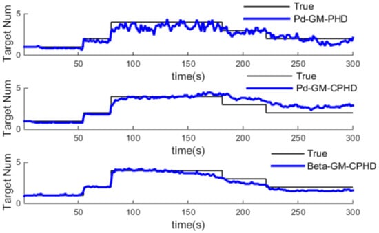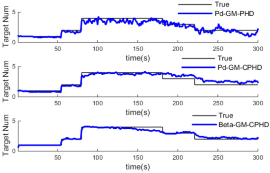 From Figure 9, Figure 10 and Figure 11, we can see that estimation of target number is credible after 80 s. The estimated value obviously deviates from the true value when using GM-CPHD with constant detection probability. As the detection probability decreases with distance in practice, the higher the detection probability, the greater the estimation error of the target potential. On the contrary, a low detection probability performs better than a high detection probability, in which the reliability of the measurement decreases, and this leads the missing detection part to increase to remedy the update value, so the target number is more close to the true value. For the Pd-GM-CPHD algorithm, the detection probability changed with distance. However, when the target distance is more than 2km, the detection probability dropped to less 0.4. In this case, even the estimation of the target number deviates from the true value, but it still has a certain tracking ability. In general, the Pd-GM-CPHD algorithm is more accurate in estimating the target number.