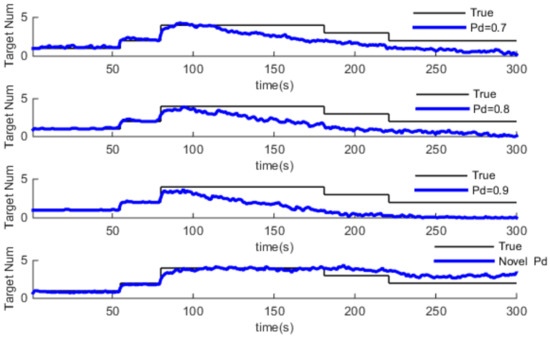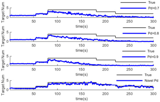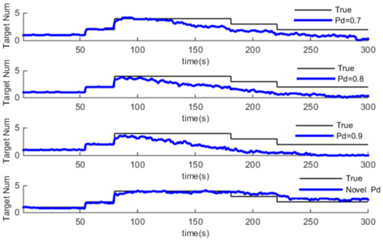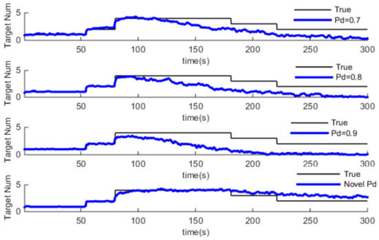 In this part, we use the same adaptive gating technical for the GM-PHD algorithm, then, we compare the GM-PHD algorithm with different constant detection probability and Pd-GM-PHD algorithm in a different clutter environment. Simulation results are shown in Figure 6, Figure 7 and Figure 8, which show the estimation of target number. Also, the average time Optimal Subpattern Assignment distance (OSPA) [28] is used to evaluate the performance of the algorithm, which is shown in Table 2.