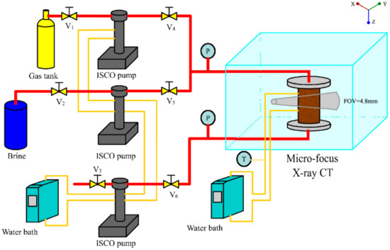 Experimental apparatus. The syringe pumps, ISCO pumps, were used as injection pumps and back pressure pump. The micro–computed tomography (Micro-focus X-ray CT) was configured under the same parameters between different sets of experiments. The length of the FOV (field of view) of the packed beads was 4.8 mm.