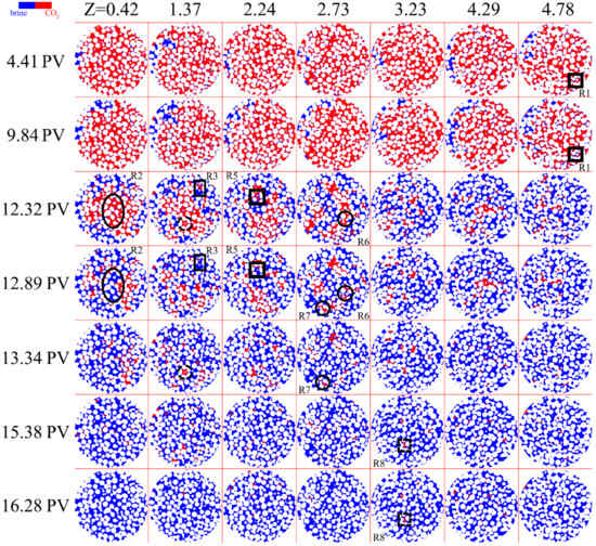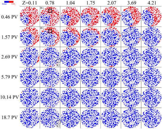 The time-lapse images of CO2-brine dissolution were rendered for selected slices, as shown in Figure 2. It is demonstrated that the overall dissolution rates are sensitive to the aqueous flow field, which was affected by the CO2 distribution and the resulting reductions in relative permeability [20,21]. In the first few pore volumes (PV), the brine invaded along the side of the core and formed a continuous flow path. With the continuous injection of brine, the flow path expanded radially and stretched to the surrounding pores. The flow development in the downward imbibition was severely affected by the gravity effect, and flow bypassing occurred. A small amount of brine intruded into other areas of the core and formed film flow on the surface of the wetting porous media. The film water and corner flow in the former PV resulted in the swelling of thin film within pores and subsequent fragmentation of CO2 droplets (shown in Figure 2 R1). The water flow between CO2 bubbles and pore walls was found to affect the CO2 dissolution rate [22]. In this period, the dissolution rate was controlled by the extension of the flow path. The fundamental reason for this is that further dissolution based on flow development was hindered by the pore structure under the gravity effect. The critical time of the dissolution rates was observed to be extremely sensitive to the position and size of the heterogeneous region, suggesting the disruption of the pore structure to the phase equilibrium [23].