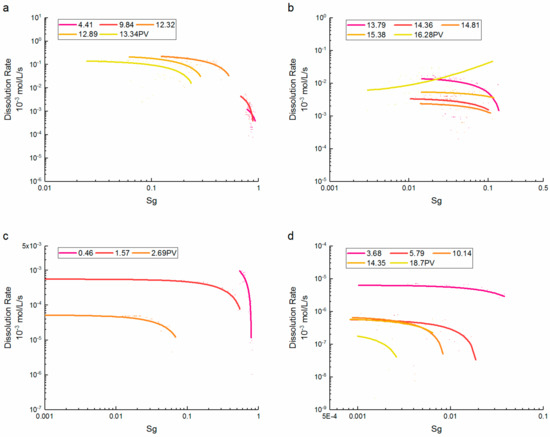 where is the CO2 saturation, is the volume of CO2 phase, and is the porosity. As the CO2 saturation increased, almost all CO2 dissolution rates had slight variations. Consequently, after the saturation exceeded a certain threshold, the dissolution rate plummeted severely, which even varied from one to two orders of magnitude at the same PV. At high CO2 saturations, concentration gradients were near zero because of the low velocities and prolonged contact with CO2. This further reduced the active mass transfer from high saturation regions and illustrates the important role of low to medium saturations [20]. The plots of dissolution rate vs. saturation in Figure 5 were divided into two categories due to the significant differences of value ranges at different PVs, and the threshold of saturation was chosen as 0.1.