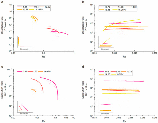 In Figure 6, the order of the dissolution rate and the relevant range of Re varied widely at different PVs. Therefore, we adopt similar methods as the diagrams of the saturation–dissolution rate to distinguish the character of the dissolution rate when the Re distributions were concentrated in the later period of CO2 dissolution. The corresponding linear relationships are presented visually in the insets.